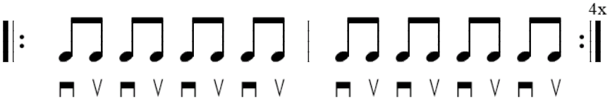 Por fim, a terceira figura – a COLCHEIA. Com o valor em meio tempo, você deve tocar dois sons de valores iguais para cada batida do metrônomo. Neste caso, você vai usar a palhetada alternada (para baixo e para cima), para que a divisão fique mais clara. Considerando a colcheia como uma subdivisão da semínima, ela será agrupada em pares de modo que, cada par, deve representar uma batida do metrônomo (e do seu pé).